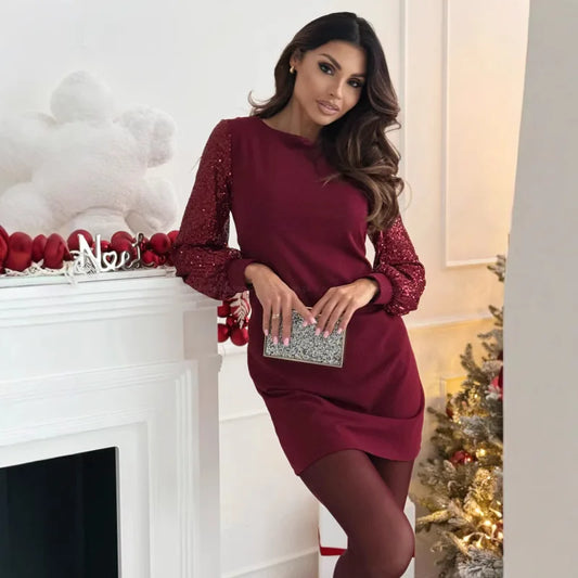 Sequin Patchwork Dress — Elegant Round Neck Midi