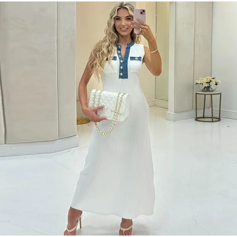 Own your look with the Elegant Knit Denim Splice Midi Dress — where comfort and cool collide in the best way.