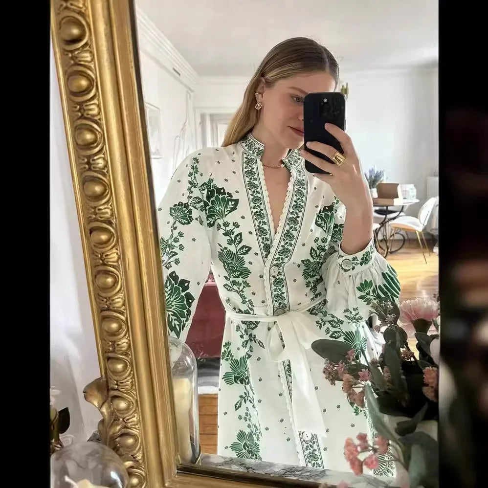 Earthy hues and botanical tones connect you with the outdoors, making this dress feel organic and calming — a wardrobe refresh that mirrors nature’s charm.